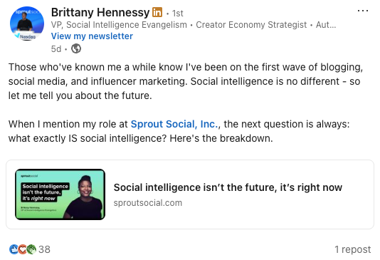 At Sprout, we have a constant stream of content from various voices within our organizations that speak to different aspects of the day-to-day. For example, here’s a post from our VP of Social Intelligence Evangelism, Brittany Hennessy: