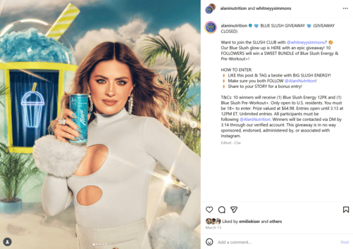 One of its most effective influencer marketing examples was its special-edition Blue Slush flavor, created in partnership with Whitney Simmons. In conjunction with the announcement post, Alani launched a giveaway to generate more buzz and bolster engagement. The two posts were collaborative, appearing on both Alani Nu and Whitney’s accounts to drive visibility.