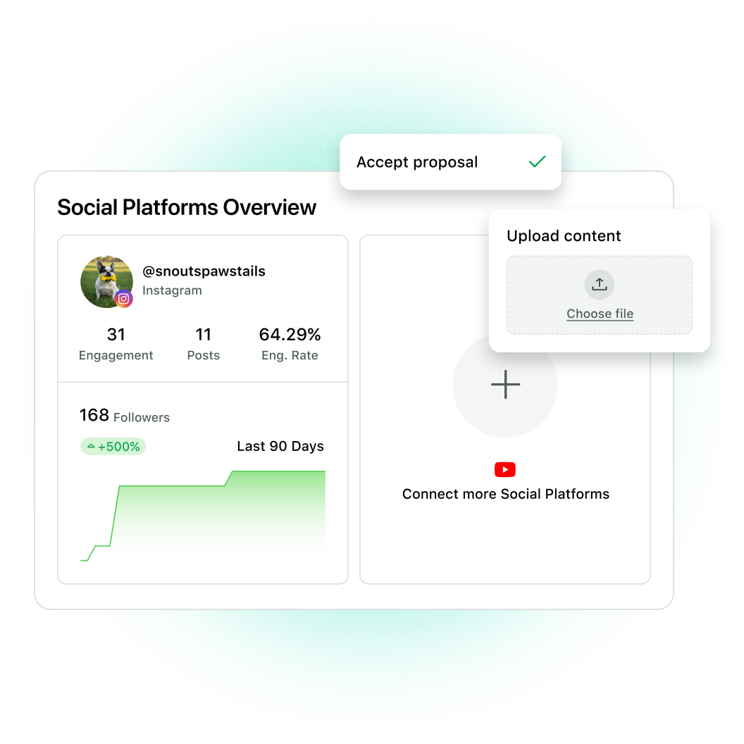 Creator Hub transforms scattered messages and lost emails into a professional home base where creators can collaborate with brands, accept proposals, upload content, receive feedback and monitor their overall social performance—all in one place.